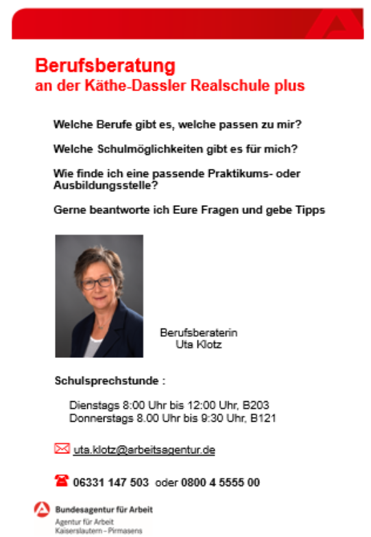 Frau Klotz von der Arbeitsagentur bietet für die Schüler*innen regelmäßig Sprechstunden in der Schule an (Kontaktdaten und Zeiten siehe unten)